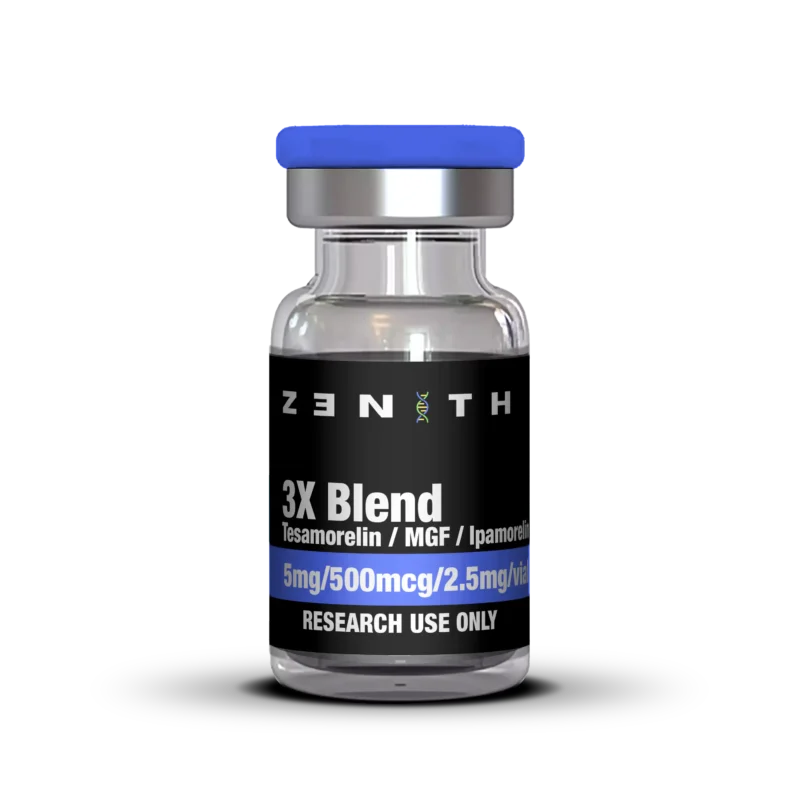 - A blend of Tesamorelin (5mg), MGF (500mcg), and Ipamorelin (2.5mg) studied for its role in regulating growth hormone (GH) secretion and cellular processes.